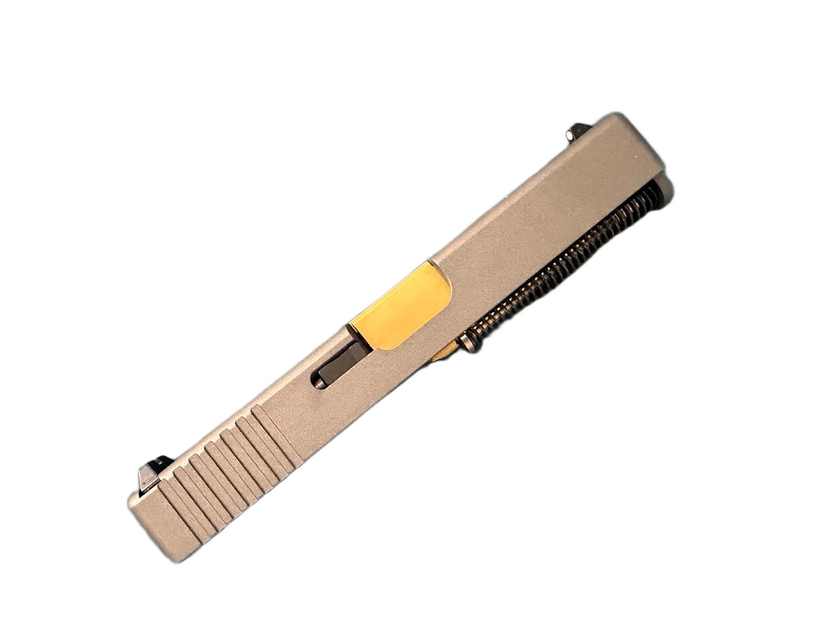 OEM-look rear serrated slide for Glock 19 Gen 3. Finished in Tungsten cerakote and standard height polymer sights installed. Comes with a Titanium Nitride crown/flush cut barrel chambered in 9mm luger