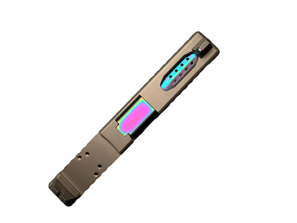 Crown/flush cut ported PVD rainbow/oil-slick/chameleon barrel. Ported barrels redirect gases upward to reduce muzzle flip and recoil. A heavier grain ammo is recommended during the break in period.