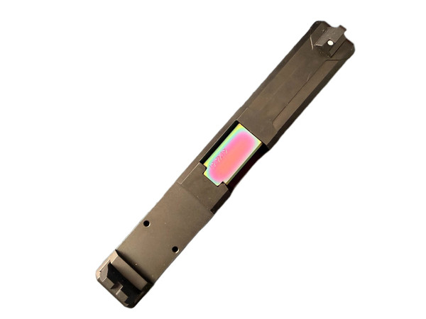 Custom diamond grip RMR slide for Glock 19 Gen 3. All internals installed. Included recoil rod. Tall sights for co-witnessing with an optic. Oil slick/rainbow PVD crown/flush cut barrel. Finish will wear with use and metal to metal contact.