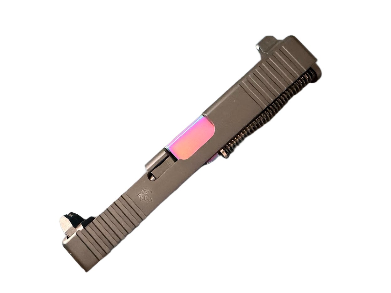 Complete assembled OEM-look slide with RMR footprint, front and rear serrations for ease of operation. Tall sights for co-witnessing with an optic. Crown/flush cut PVD chameleon barrel chambered in 9mm luger. Finish will wear with use and metal to metal contact