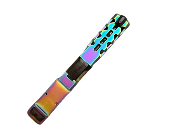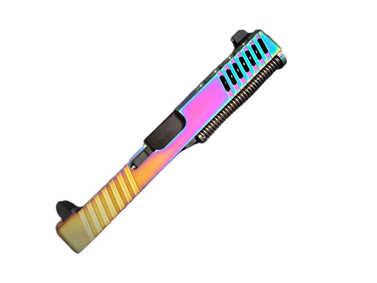 Matrix Arms PVD rainbow/chameleon/oil slick finish slide for Glock 17 Gen 3. RMR footprint for mounting an optic Tall sights for co-witnessing with an optic All internals installed Full length black nitride barrel Requires lube and a break in period.