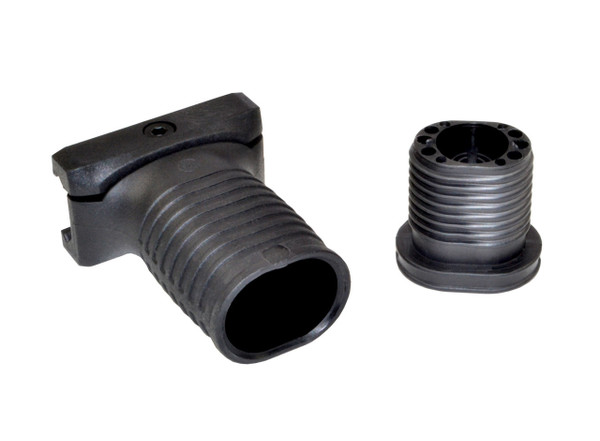 Push In / Pull Out End Cap/Plug: The foregrip is equipped with a convenient push in / pull out end cap or plug. This design feature allows for quick access to the internal storage compartment without the need for additional tools.